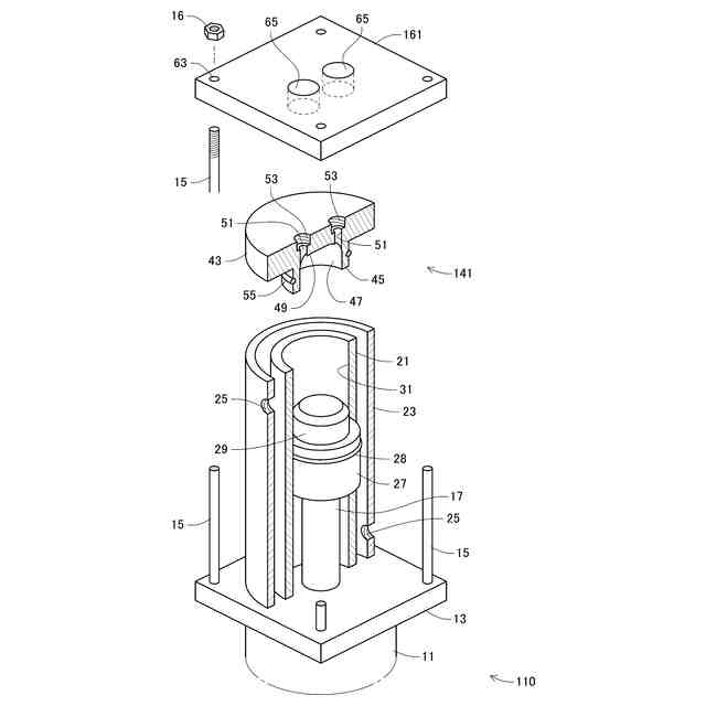 ヘッドカバー押えは、ヘッドカバーを基準としてシリンダの反対側に配置される。ヘッドカバー押えは、シリンダと接触しなくても良い。ヘッドカバー押えとヘッドカバーは、隣接する場合がある。ヘッドカバー押えとヘッドカバーの間には、何らかの介在物を挟み込む場合もある。