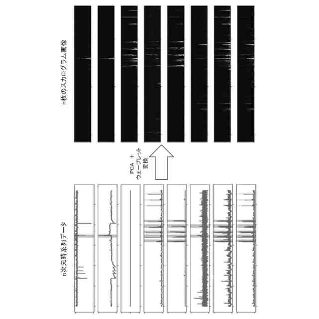 例えば、各次元の時系列データに対して個別にウェーブレット変換、グラミアン角場等を用いて画像化を行い、得られた次元分の画像を並べて一枚の画像とすることで、多次元の時系列データを取り扱う方法が提案されている。