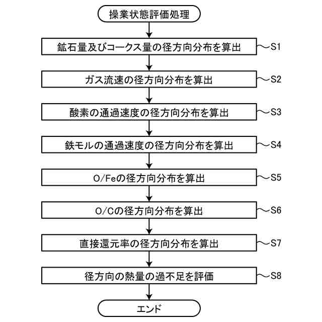 に含まれる酸素と炭素のモル数の比の径方向分布を算出する第六ステップと、酸素と鉄のモル数の比の径方向分布と酸素と炭素のモル数の比の径方向分布をリストモデルに適用することにより、操業時の直接還元率の径方向分布を算出する第七ステップと、算出された直接還元率の径方向分布を用いて、径方向における供給熱量の過不足を評価する第八ステップと、を含む。