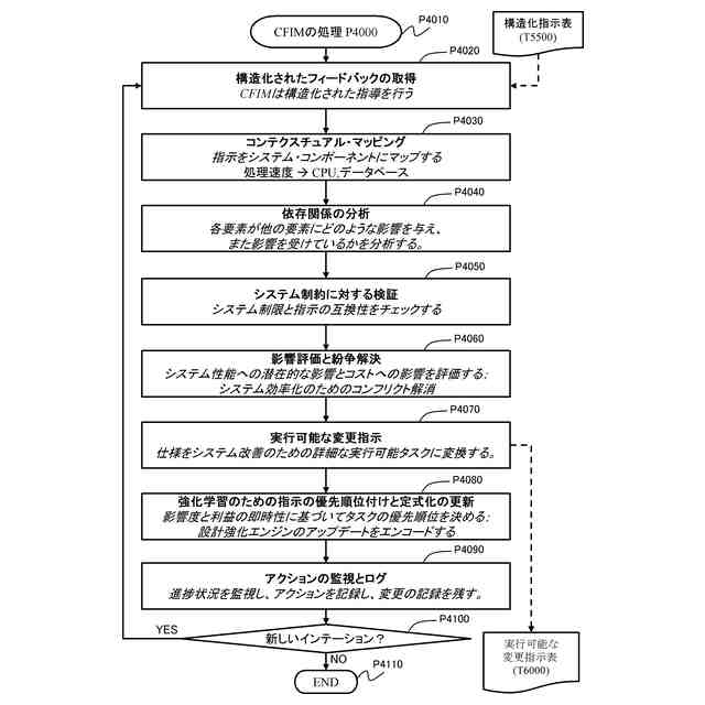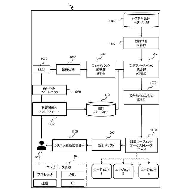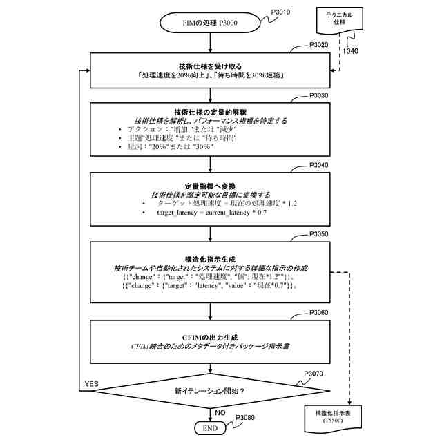 入力された情報から技術仕様を生成するように学習された大規模言語モデル部により、前記受け付けられたフィードバックから技術仕様を生成し、