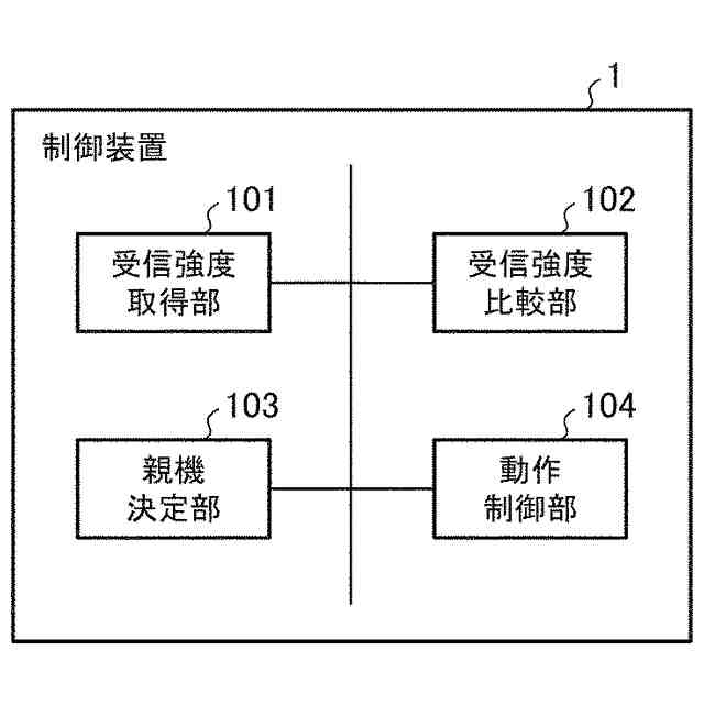 【解決手段】制御装置1は、受信強度取得部101により複数の親機2について共通する子機3との間での通信における受信強度を示す情報が取得された場合に、受信強度比較部102による比較結果に基づいて、複数の親機2のうち、受信強度が大きい親機2を、子機3との間で通信を行う親機2として決定する親機決定部103と、受信強度取得部101により受信強度を示す情報が取得された複数の親機2のうち、子機3との間で通信を行う親機2については動作を継続させ、残りの親機2については動作を停止させる動作制御部104と、を備える。動作制御部104は、子機3との間で通信を行っている親機2での受信強度が所定範囲内となるように、当該子機3の送信強度調整を行う。