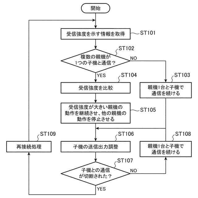 前記親機決定部による決定に基づいて、前記受信強度取得部により受信強度を示す情報が取得された複数の前記親機のうち、前記子機との間で通信を行う前記親機については動作を継続させ、残りの前記親機については、前記子機との間で通信を行う前記親機に対して低頻度で動作させる動作制御部とを備え、