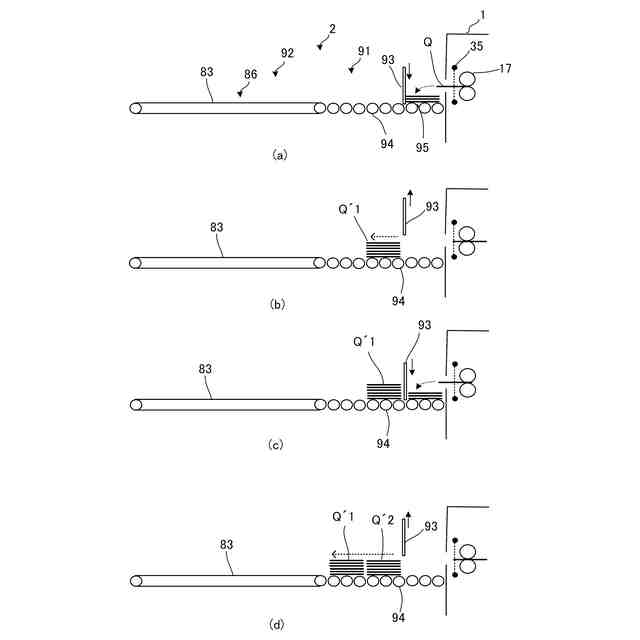 請求項4記載の発明は、請求項2記載の用紙積載装置において、前記サイドガイドは、前記幅方向に隣接して設置される第1のサイドガイドと第2のサイドガイドとを備え、前記第1モードにおいては、前記第1のサイドガイドは、前記用紙の一方の側縁に接触する位置に、前記第2のサイドガイドは、前記用紙の他方の側縁より所定距離だけ離れた位置に配置される、ことを特徴とするものである。