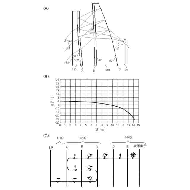 各実施例における表示光学系のうち第1分類の光学系は、瞳面側から表示面側へ順に配置された、透過面かつ反射面としての2つの透過反射面(第1透過反射面と第2透過反射面)を有する。また第2分類の光学系は、瞳面側から表示面側へ順に配置された、第1光学系(瞳面側光学系)と、第2光学系(透過反射光学系)と、第3光学系(パネル側光学系)とを有する。第2光学系は、2つの透過反射面(第1透過反射面と第2透過反射面)を含み、それらによって挟まれる光学系である。第1光学系は、瞳面と第1透過反射面とにより挟まれた光学系である。第3光学系は、第2透過反射面と表示素子とにより挟まれた光学系である。第1光学系および第3光学系はそれぞれ存在しない場合もある。
