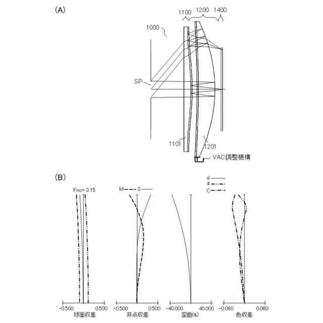 実施例1の表示光学系の調整なし時の断面図および収差図。
