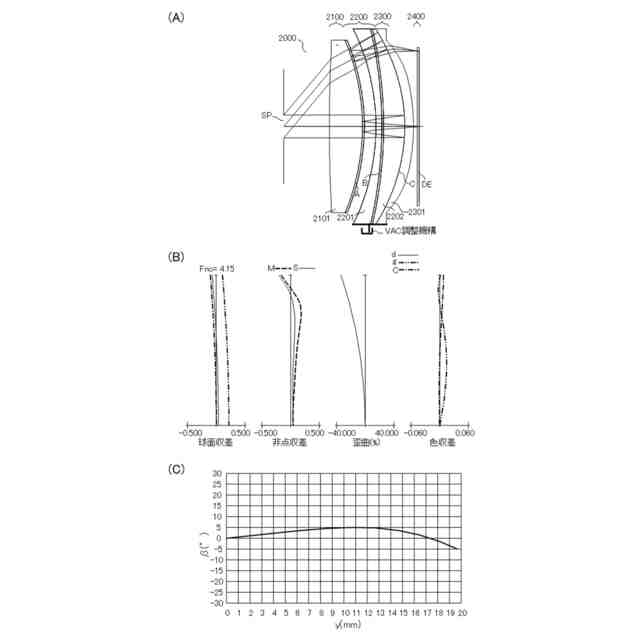 実施例2の表示光学系の-5D調整時の断面図および収差図。