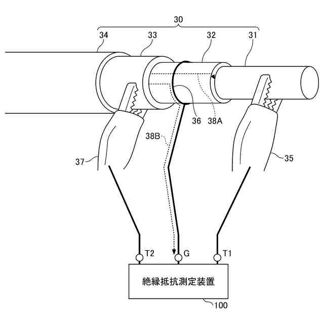 図1は、第1実施形態の絶縁抵抗測定装置を用いた測定方法を示す図である。図1に示すように、高圧ケーブル30は、芯線31、絶縁体32、シールド層33及び絶縁体34を備えている。芯線31を絶縁体32が囲み、絶縁体32をシールド層33が囲み、絶縁体34がシールド層33を囲む。
