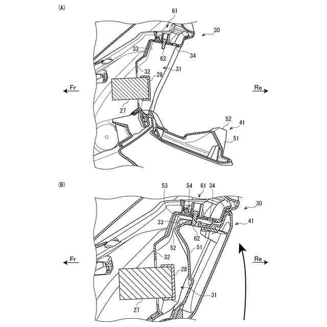 鞍乗型車両等では、燃料タンクの給油口を覆うフューエルリッドを備えたものが知られている(例えば、特許文献1参照)。特許文献1に記載のフューエルリッドの基端部がフューエルトレイに揺動可能に支持されており、フューエルリッドの開放端には掛留片が設けられている。フューエルトレイの開口縁からロック機構の突起部が内向きに突き出しており、フューエルリッドの掛留片がロック機構の突起部に引っ掛かることでフューエルリッドがロックされる。また、フューエルリッドの掛留片からロック機構の突起部が外れることでフューエルリッドのロックが解除される。