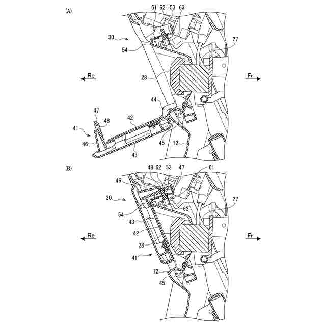 鞍乗型車両等では、燃料タンクの給油口を覆うフューエルリッドを備えたものが知られている(例えば、特許文献1参照)。特許文献1に記載のフューエルリッドの基端部がフューエルトレイに揺動可能に支持されており、フューエルリッドの開放端には掛留片が設けられている。フューエルトレイの開口縁からロック機構の突起部が内向きに突き出しており、フューエルリッドの掛留片がロック機構の突起部に引っ掛かることでフューエルリッドがロックされる。また、フューエルリッドの掛留片からロック機構の突起部が外れることでフューエルリッドのロックが解除される。