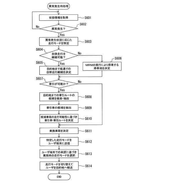 【解決手段】 制御装置300は、車両Vの自律走行を制御する処理と、車両Vに異常が発生したと判断した場合に実行可能な走行モードを特定する処理と、該走行モードを車両Vに乗車中のユーザの端末装置20に送信し、ユーザが承諾した一の走行モードに応じて故障車両Vbの走行を制御する処理と、を実行するコントローラ305を備え、コントローラ305は、故障車両Vbの自律走行が困難と判断した場合に他の車両Vが故障車両Vbを電子牽引する牽引モードを特定可能であり、走行モードとして牽引モードが特定された場合に故障車両Vbが電子牽引で目的地まで走行する牽引ルート及び牽引車両を決定する。