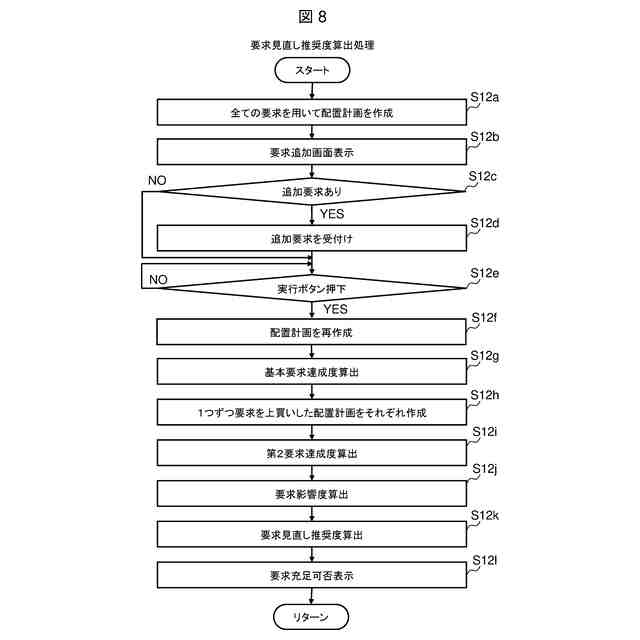 前記要求毎の前記要求度と該要求毎の前記要求影響度とに基づいて、各該要求を、前記配置計画の作成の際の見直し対象の要求として推奨する優先順位を表す要求見直し推奨度を該要求毎に算出する