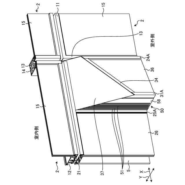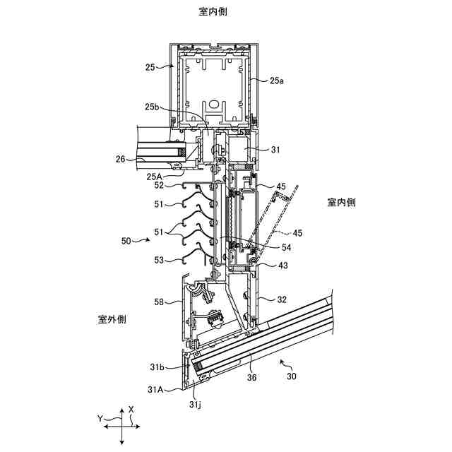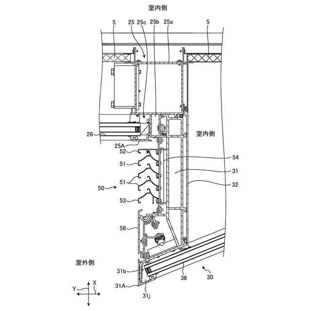 これに対して換気用カーテンウォール1は、上枠21、下枠22、左右の縦枠23,24によって構成した枠体20に上下に沿うように縦中骨25を配設し、縦中骨25の一方側に複層ガラス等のパネル26を配設する一方、縦中骨25の他方側に室外に突出する出窓部30を構成したものである。以下、室外から建築物の外壁面に正対した状態で左側に配置される縦枠(以下、左縦枠23という)と縦中骨25との間にパネル26を有し、右側に配置される縦枠(以下、右縦枠24という)と縦中骨25との間に出窓部30を有した換気用カーテンウォール1の構成について主に説明する。なお、以下においては便宜上、建築物の外壁面に沿った水平方向をX方向、外壁面に直交する水平方向をY方向として説明を行う。すなわち、図示の例では、パネル26はX方向に沿って配設してあり、出窓部30がY方向室外側に突出するように設けてあるものとする。