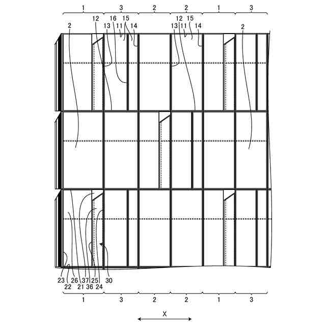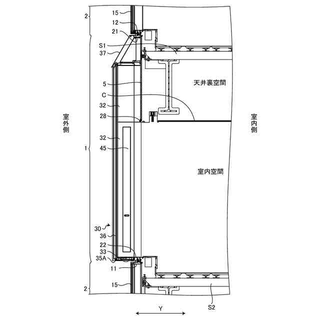 図1~図9は、本発明の実施の形態である通気制御装置を適用した換気用カーテンウォールを示したものである。ここで例示する換気用カーテンウォール1は、標準カーテンウォール2及び分割標準カーテンウォール3と組み合わせて縦横に配列することにより建築物の外壁を構成するものである。建築物は、上層の床スラブS1と下層の床スラブS2との間に天井板材Cを設けることにより、天井板材Cよりも下方に室内空間を構成するとともに、天井板材Cよりも上方に天井裏空間を構成するものである。上述した換気用カーテンウォール1、標準カーテンウォール2、分割標準カーテンウォール3は、上下の床スラブS1,S2の室外側となる部分に配設してある。標準カーテンウォール2は、標準上枠11、標準下枠12、左右の標準縦枠13,14によって構成した枠体10の内部に複層ガラス等の標準パネル15を配設したものである。分割標準カーテンウォール3は、標準上枠11、標準下枠12、左右の標準縦枠13,14によって構成した枠体10に上下に沿うように標準縦中骨16を配設し、それぞれの内部に複層ガラス等の標準パネル15を配設したものである。図には明示していないが、標準上枠11、標準下枠12、標準縦枠13,14、標準縦中骨16は、標準パネル15の板厚方向に沿った寸法が互いにほぼ等しくなるように構成してある。