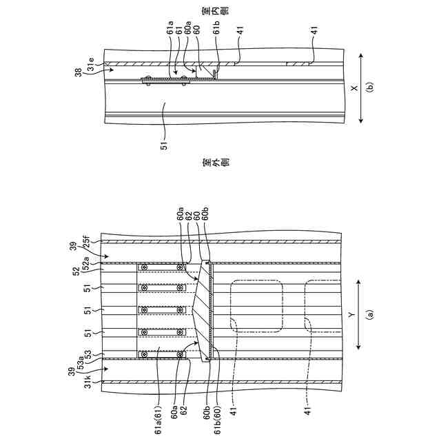 図2に示した換気用カーテンウォールの上方部分に適用した導水部材を示すもので、(a)はX方向室内側から見た拡大縦断面図、(b)はY方向室外側から見た拡大縦断面図である。