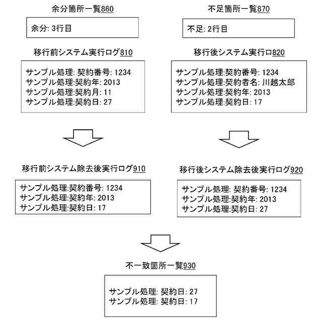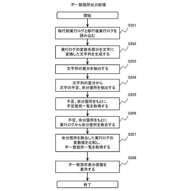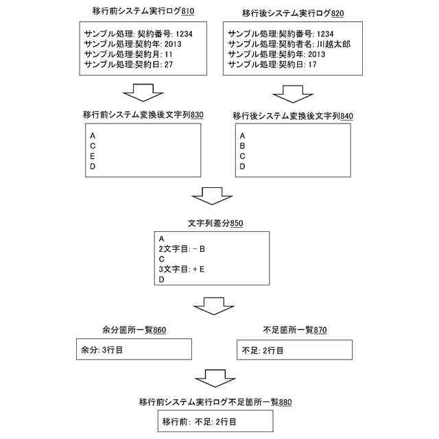 上述した技術では、システムの不具合がありそうな箇所に限定し、全実行命令のログを出力し、出力したログに沿って移行後システムの動作を再現し、不具合を再現する。しかしながら、移行前システムの機能が正しく移行後システムに移行されたかを照合する場合には、移行前システム及び移行後システムに同じ入力データを読み込ませ、出力の不一致が起きた場合にプログラム上での不一致箇所を特定する必要がある。これに対し、上述した技術では、移行後システムの不具合を再現することはできても、移行前システム及び移行後システムの不一致の原因を特定することはできない。そのため、移行前システムの実行ログと移行後システムの実行ログとの比較により、不一致原因を特定する必要があるが、移行前システムの実行環境を用意できず、移行前システムの実行ログを出力できないことがある。