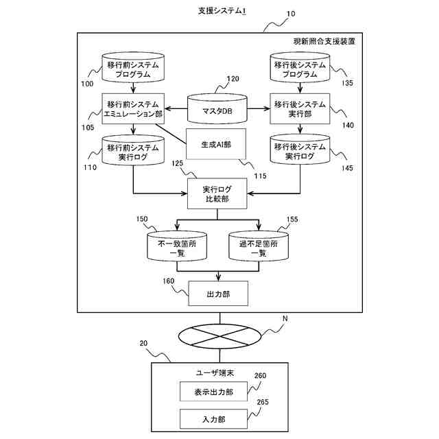 【解決手段】所定のプログラミング言語で記述された第1システムを他のプログラミング言語に移行した第2システムの動作の検証を支援する支援装置であって、第1システムの第1プログラムを含むプロンプトを自然言語モデルに入力することにより、自然言語モデルに第1システムをエミュレーションさせ、その実行結果として第1システムのプログラムの変数値を含む第1実行ログを取得し、第2システムの第2プログラムを実行することにより、第2システムの第2プログラムの変数値を含む第2実行ログを取得し、第1実行ログと第2実行ログとを比較することにより、第1システムと第2システムとで変数値が一致しない不一致箇所を特定して出力する。