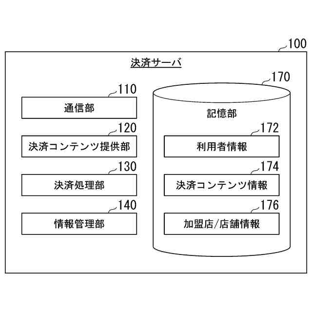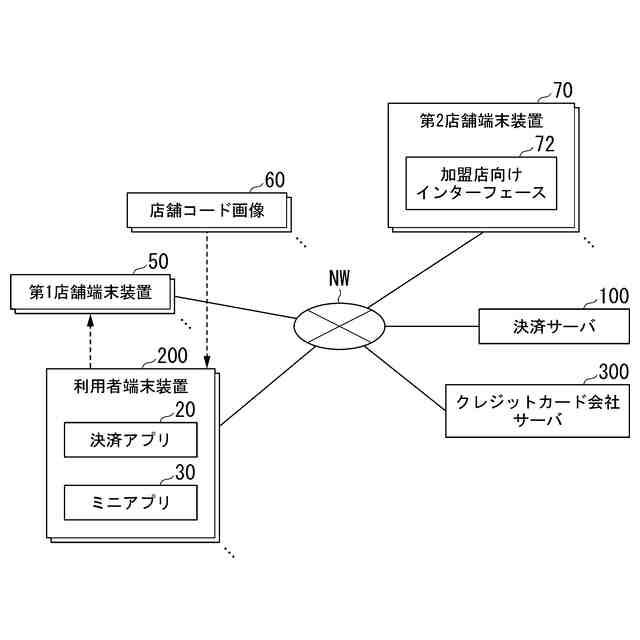 図1は、電子決済サービスが実現されるための構成の一例を示す図である。電子決済サービスは、決済サーバ100を中心として実現される。決済サーバ100は、例えば、一以上の利用者端末装置200、一以上の第1店舗端末装置50、一以上の第2店舗端末装置70、およびクレジットカード会社サーバ300のそれぞれとネットワークNWを介して通信する。ネットワークNWは、例えば、インターネット、LAN(Local Area Network)、無線基地局、プロバイダ装置などを含む。