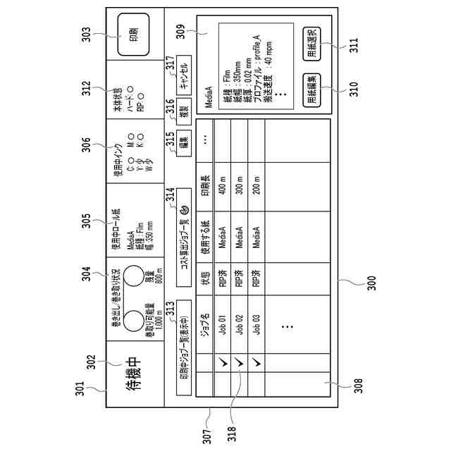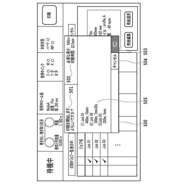 印刷ジョブに基づく印刷をロール紙に実行する際に、印刷ジョブの用紙量と、ロール紙の残量およびロール紙を巻き取る側の巻き取り可能量とを比較して、印刷ジョブに基づく印刷が可能であるかをチェックする技術がある。特許文献1には、ロール紙を巻き取る側の巻き取り可能量が次のジョブに要する用紙長に足りない場合に、巻き取り可能量が足りないことを警告する警告画面を表示する技術が開示されている。特許文献1では、複数の印刷ジョブに基づく印刷を実行する際に、1つ目の印刷ジョブに基づく印刷が終了後、印刷動作を一旦停止し、その後、後続ジョブの印刷が可能であるかをチェックしている。