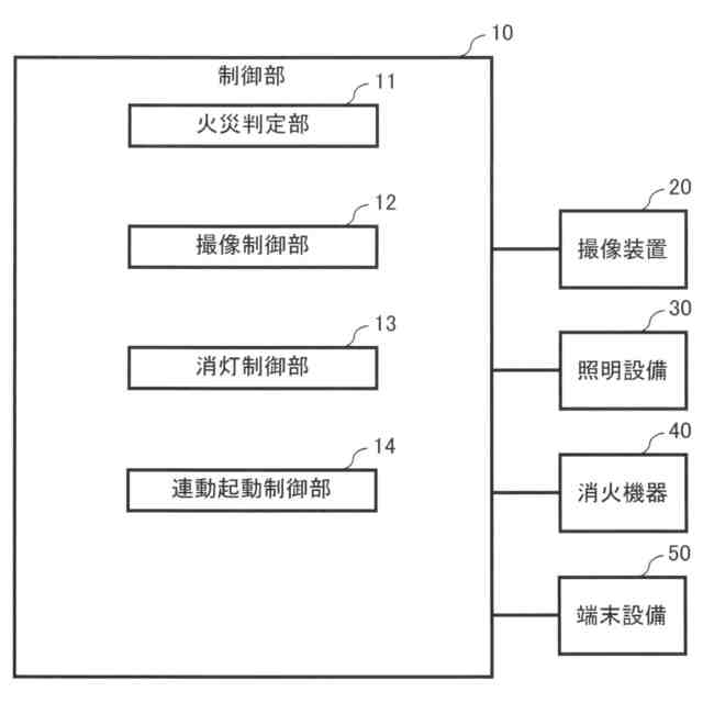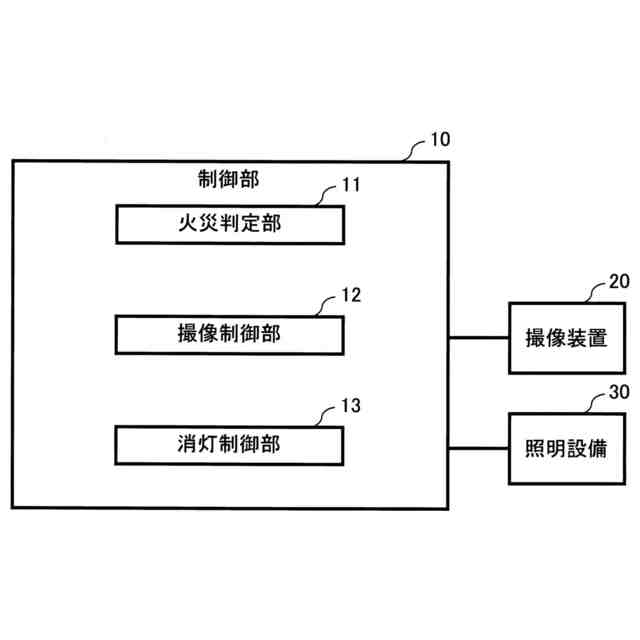 【解決手段】火災監視領域を撮像する撮像装置と、火災監視領域に設置されている照明設備と、撮像装置による撮像結果から火災監視領域で火災が発生したか否かを判定する制御部とを備え、制御部は、あらかじめ決められたタイミングで照明設備のうち、制御部による火災が発生したか否かの判定結果に影響を与えてしまう照明系統を消灯状態とし、消灯状態における撮像装置による撮像結果を判定用画像として取得し、判定用画像の中であらかじめ決められた輝度以上の領域を抽出し、抽出結果に基づいて火災監視領域で火災が発生したか否かを判定する。