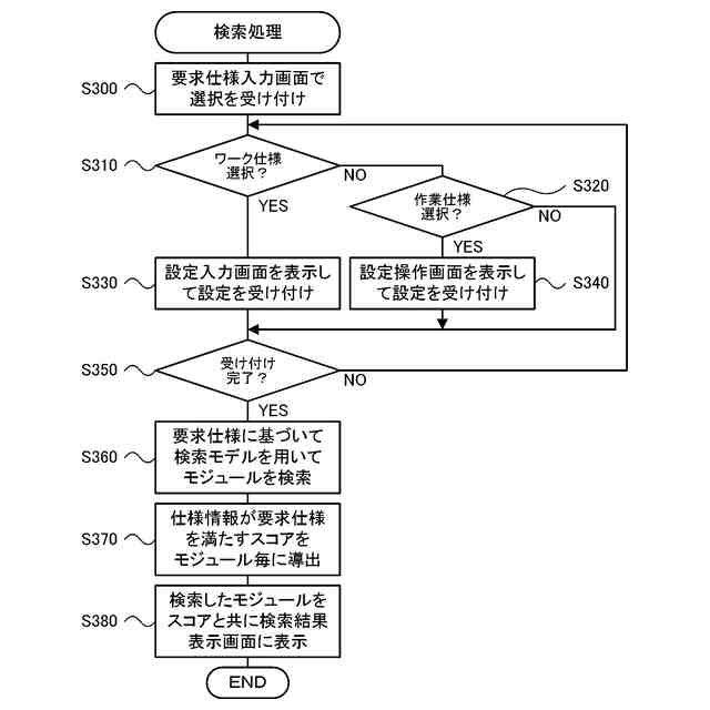 前記検索部は、前記モジュールを検索する際に前記仕様情報が前記要求仕様を満たす度合いを示すスコアを導出し、検索した前記モジュールを前記スコアと共に出力する、