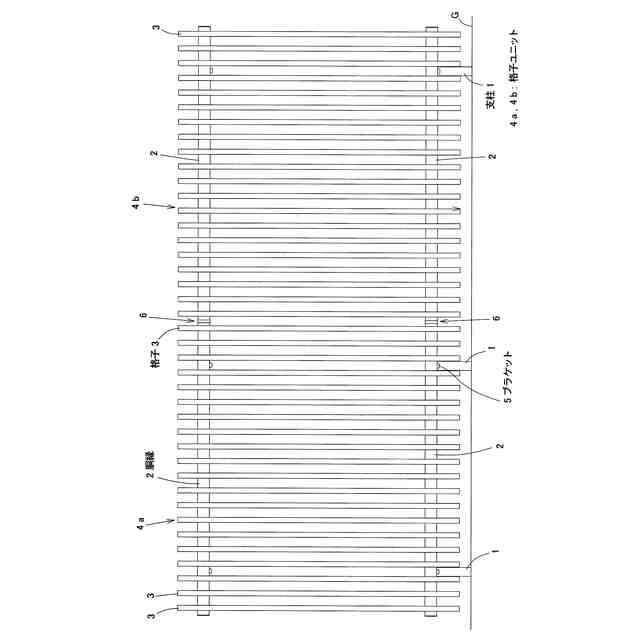 格子ユニット4a,4bは、上下に間隔をおいて配置された複数の胴縁2,2と、胴縁2,2の道路側の面に左右方向に間隔をおいて取付けた多数の格子3,3,…を有している。