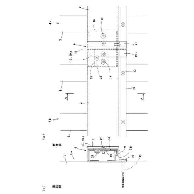 (a)は隣り合う格子ユニットの胴縁同士の連結部を敷地側から見た図であり、(b)はA-A断面図である。