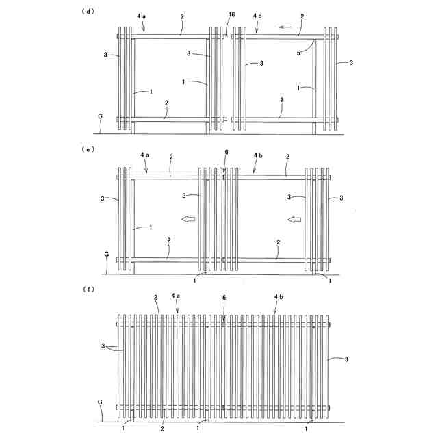d.格子ユニット4a,4bの胴縁2,2の長手方向中間部に格子3,3,…を取付ける工程。