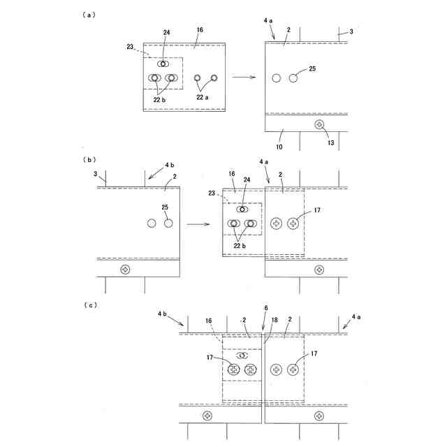 b.胴縁2,2の長手方向両端部に格子3,3,…を取付けて格子ユニット4a,4bを組立てる工程。