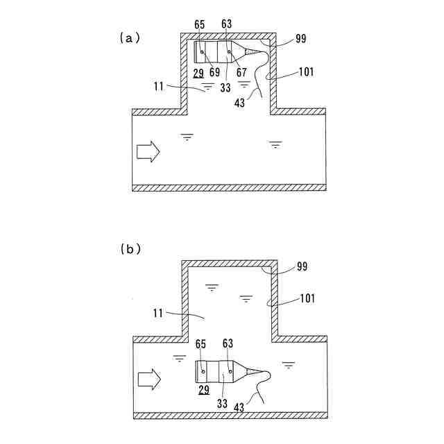 下水管路システムとしては、ポンプによる圧力を利用する圧力管路方式のものと、地盤の高低差を利用する自然流下方式のものとが用いられているが、圧力管路方式のものの管路内面の腐食状態の調査では、管路が山部及び谷部を有していることや満管状態の管路個所を通過させる必要があるために、自然流下方式のものの管路内面の腐食状態の調査で用いられている走行車輪を有する調査機器や水上航行体を有する調査機器は基本的には利用することが困難である。また、モータなどの駆動機構を有するものも圧力管路内に入れるには大きすぎるので簡単には利用できない。