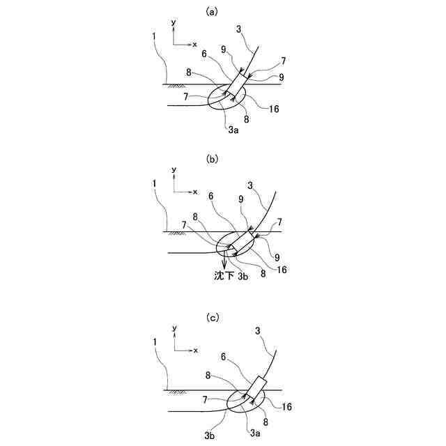 【解決手段】この水中ケーブル埋設装置は、ケーブル3の水底地盤1より上の位置に移動可能に外嵌された筒状の噴射管6と、噴射管6の水底地盤側に向けた前方噴射ノズル8,8…と、噴射管6の水面側に向けられた後方噴射ノズル9,9…と、前方噴射ノズル8,8…及び後方噴射ノズル9,9…の流体噴射量を制御する噴射制御手段とを備え、噴射管6の姿勢を制御しつつ、前方噴射ノズル8,8…から噴射された流体7により流動化した水底地盤1にケーブル3の噴射管6の水底地盤側端面より先に位置する部分3bを自重により沈下させて水底地盤1にケーブル3を埋設するようにしている。