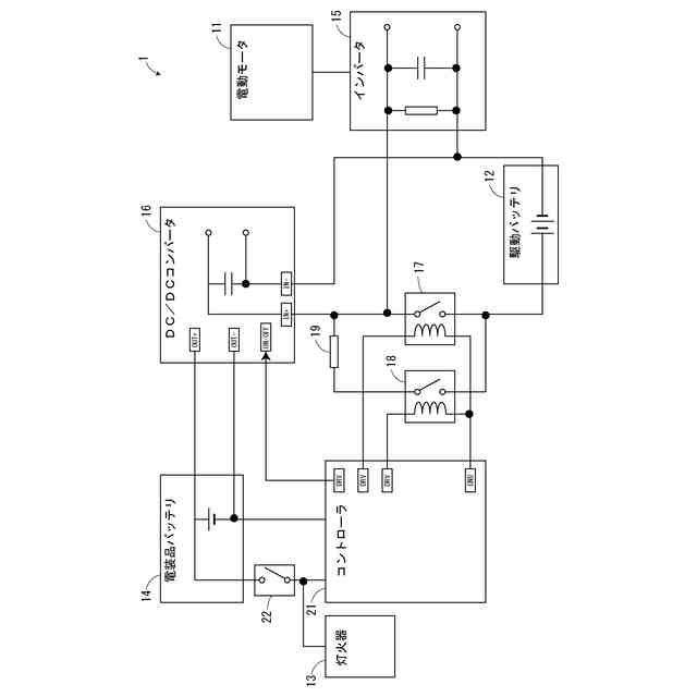 近年では、電動モータを動力源とする鞍乗型車両が開発されており、この鞍乗型車両には電動モータ用の駆動バッテリの他に、灯火器等の電装品用の電装品バッテリ(補機バッテリ)が搭載されている。電装品バッテリには駆動バッテリの電力が充電されるが、駆動バッテリが電装品バッテリよりも高圧であるため、駆動バッテリがDC/DCコンバータを介して電装品バッテリに接続されている。そして、DC/DCコンバータによって駆動バッテリの電圧が降圧されて電装品バッテリが充電されている(例えば、特許文献1参照)。