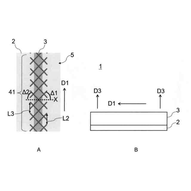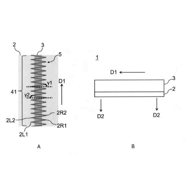 図3は、基材2を湾曲させる力の方向と、当該方向に湾曲する力を発生するための糸状体4の縫い付け方向および配置について説明するための概略図である。
