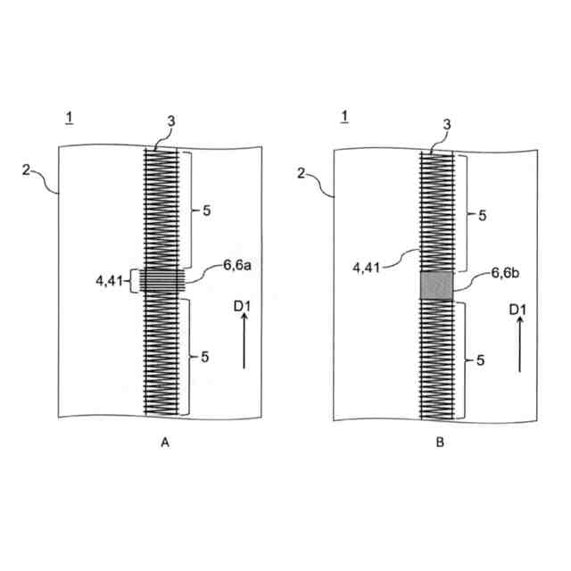 前記糸状体第1部分が、前記基準線から前記軸方向に左側上に縫い付けられている時に前記基材を左方向にひねる力が発生し、