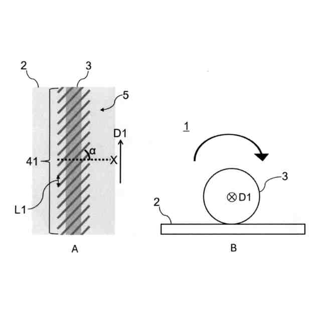 図5は、基材2を湾曲させる力の方向と、当該方向に湾曲する力を発生するための糸状体4の縫い付け方向および配置について説明するための概略図である。