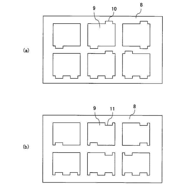 本発明の有機発光素子の実施形態のチップ切断前の平面模式図であり、(a)は識別部が凸部で、(b)は識別部が凹部でそれぞれ形成された実施形態である。