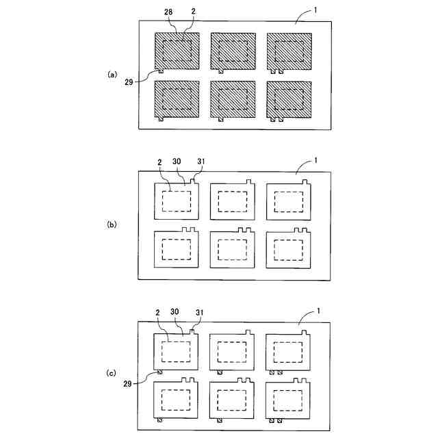 本発明の有機発光素子の他の実施形態のチップ切断前の平面模式図であり、(a)は有機化合物層の平面形状を、(b)は金属層の平面形状を、(c)は金属層まで蒸着した状態での平面形状をそれぞれ示す図である。