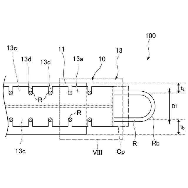 前記軸方向において、前記リブの端部は、前記周壁の端部と、前記周壁の端部の隣に位置する前記鉄筋配列面と、の間に位置する、