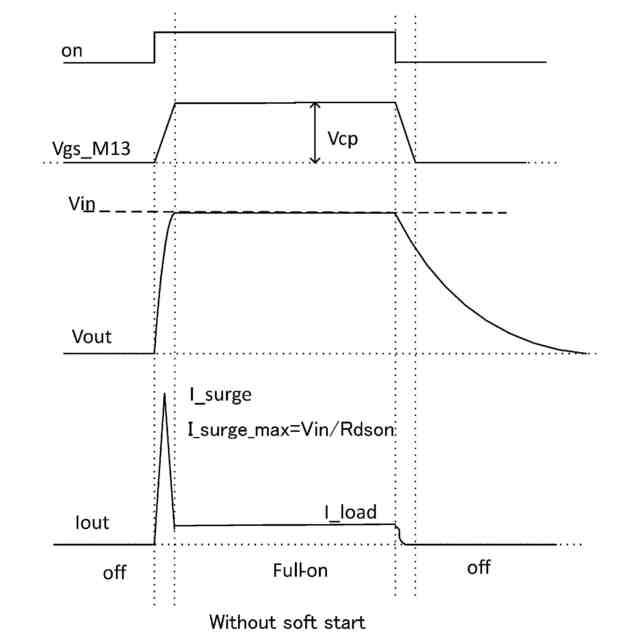 ソフトスタートなしに出力トランジスタをオンした場合の波形を示す図である。