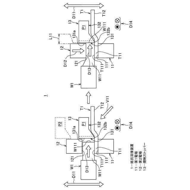 【解決手段】抵抗溶接装置1が、第1電極11と、第1電極11上の接続部分T11及び電線W1の素線部分W11を第1電極11との間に挟んだ状態で第1電極11への加圧を行いつつ通電されることで素線部分W11を接続部分T11に抵抗溶接する第2電極12と、少なくとも抵抗溶接の際には、電線W1における素線部分W11の延出方向D13について、当該素線部分W11の先端W111の前方側に配置され、延出方向D13に伸びようとする素線部分W11の先端W111に当接して素線部分W11の伸びを規制する規制ストッパー13と、を備えたことを特徴とする。