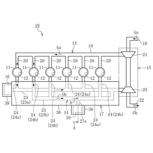 例えばディーゼルエンジンなどの内燃機関には、各シリンダの排気バルブから排出された排気ガスを合流させて排気口から外部に排出するための排気ガス流路が設けられている。また、この排気ガス流路の排気口よりも上流側には過給機が設けられており、過給機のタービンが排気ガスの流れを受けて回転することで、タービンと同軸に連結されかつ外気の取り込み口から吸気バルブに至る給気流路上に配設されたコンプレッサを作動させる。これにより、取り込んだ空気が圧縮されて燃焼室に供給されるようになっている(例えば、特許文献1を参照)。