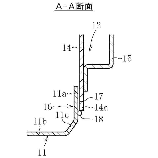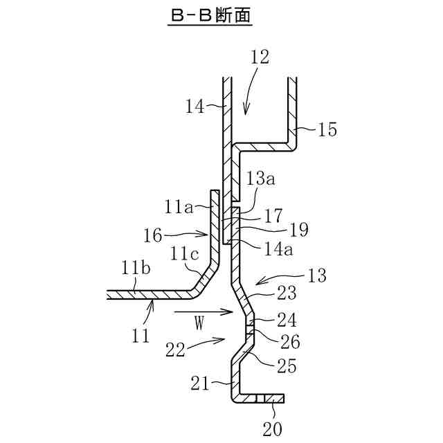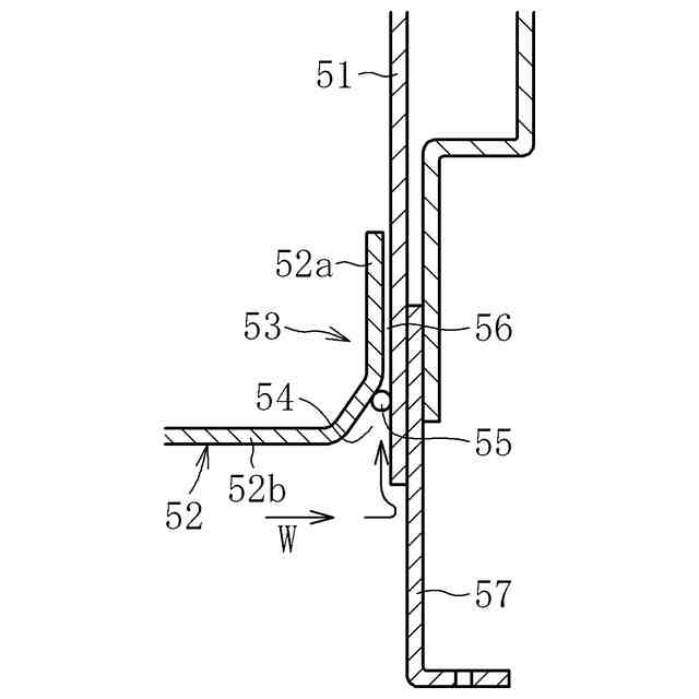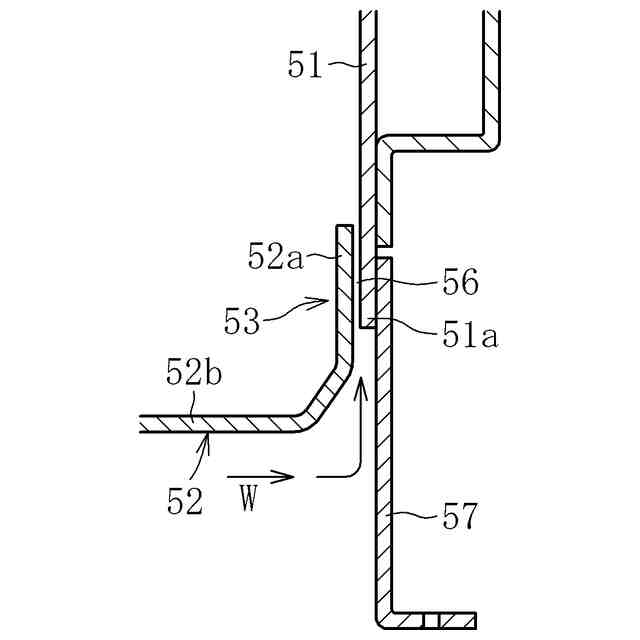 ところで、上述したロアバックインナとリアフロアパネルとの接合部位(板合わせ部)においては、水に曝されることによる錆の発生が問題となることがある。図5は、ロアバックインナ51とリアフロアパネル52との板合わせ部53周辺の断面構造の一例を示している。この図に示すように、リアフロアパネル52の後端部52aとロアバックインナ51とが接合されると共に、ロアバックインナ51が、リアフロアパネル52の底面部52bを跨いで下方に延びる形態をなす場合、リアフロアパネル52の後端部52aとロアバックインナ51のとの板合わせ部53には、下方に向けて開口する開口部54が底面部52bに隣接して設けられる。このような構造をなす場合であれば、下方からシーラガン(図示は省略)を開口部54に差し込んでシーラ55を塗布することができるので、リアフロアパネル52の後端部52aとロアバックインナ51との隙間56の車幅方向(図5でいえば紙面を貫く向き)全域にわたって容易にシーラ55を塗布することができる。そのため、走行時、路面から水Wが吹き上がって車体後方に飛散し、リアフロアパネル52よりも下方に位置するバンパブラケット57に衝突し、上方に駆け上がったとしても、シーラ55により隙間56への浸入を防止し得る。