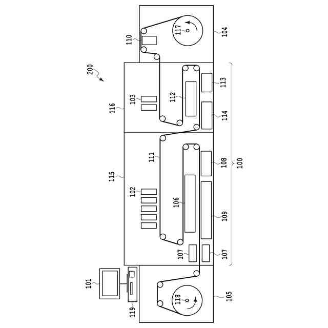 図1は、本開示の第1の実施形態に係る画像形成システム200の構成例を示す図である。画像形成システム200は、連続した画像形成が可能なロール状の記録媒体である連続紙(以下、ロール紙111という)に画像を形成する。画像形成システム200は、別館116及び本館115を有する画像形成装置100と、給紙装置104と、排紙装置105と、UI操作パネル101と、制御用PC119とを有する。別館116は、前刷り印刷として特色印刷を行う。特色印刷では、例えば、印刷データに含まれる白データの印刷が行われる。本館115は、追い刷り印刷として基本カラー印刷を行う。基本カラー印刷では、例えば、印刷データに含まれる基本カラーデータ(シアン(C)、マゼンタ(M)、イエロー(Y)、ブラック(K))の印刷が行われる。すなわち、画像形成装置100は、前刷り及び追い刷り印刷を行うデジタル印刷機であるともいえる。