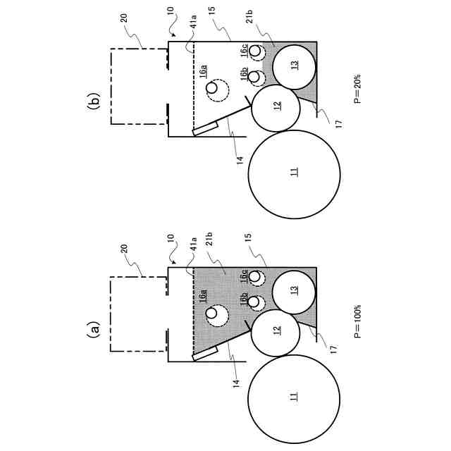 )の高い第2の現像剤(B)とが混合されている現像剤(21b)を収容している収容部(15)と、静電潜像を現像する現像剤担持体(12)と、を有し、現像剤(21b)における第1の現像剤(A)の第1の重量比率をαとし、現像剤(21b)における第2の現像剤(B)の第2の重量比率を1-αとしたときに、αは0.2以上で1未満であり、収容部(15)に収容可能な現像剤の最大重量(M)に対する収容部(15)に収容されている現像剤(21b)の重量(N)の重量百分率(P)は、20[%]以上である。