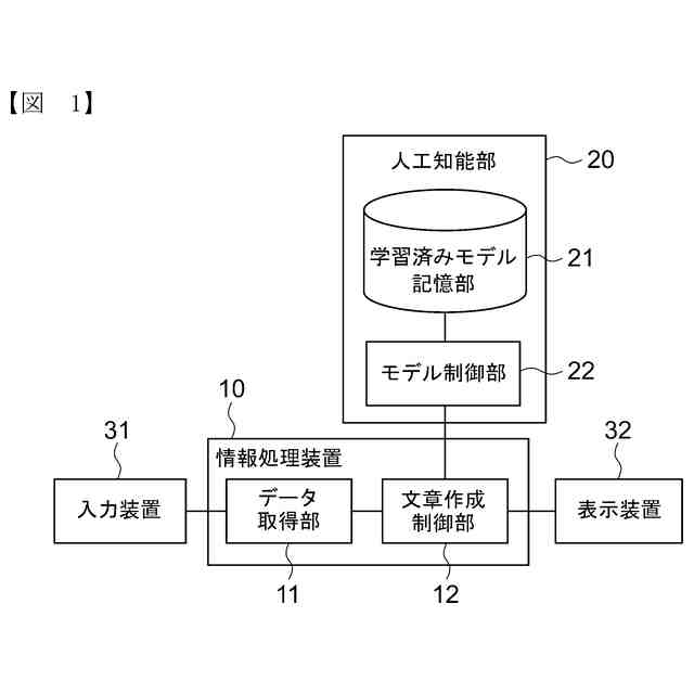 図1は、実施の形態1による特許明細書作成支援システムを示すブロック図である。図において、特許明細書作成支援システムは、情報処理装置10と、人工知能部20と、入力装置31と、表示装置32とを備えている。