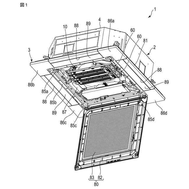 化粧パネル3は、空調対象空間の天井(図示省略)に沿うような姿勢で配置され、筐体4の下端の開口部を室内の側から覆っている。化粧パネル3は、グリル(以下、吸込グリルという)80および枠体81を備えている。