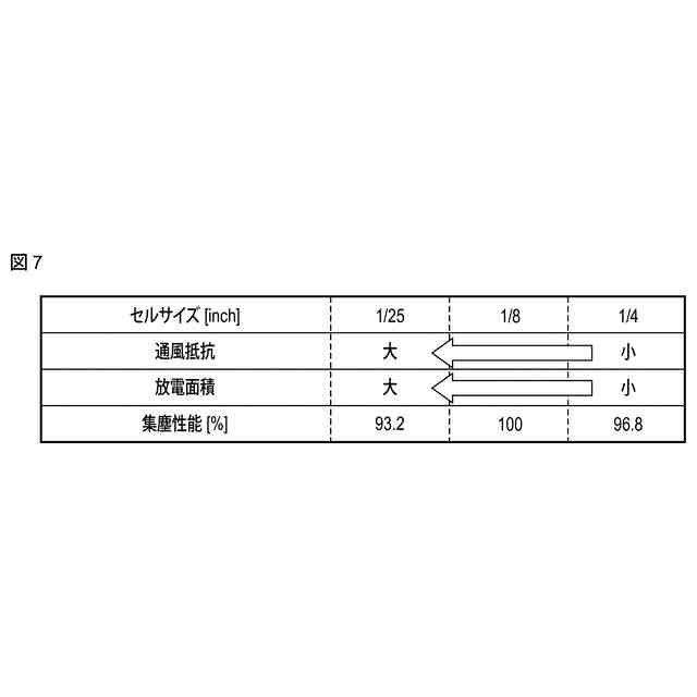 本実施形態に係る電気集塵機の対向電極の通風抵抗、放電面積、および集塵性能を、ハニカム構造のセルサイズに応じて比較して示す図である。