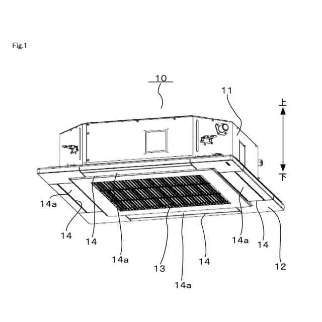 化粧パネル12は、概ね矩形の板状に形成されている。化粧パネル12には、室内の空気を吸い込む空気吸込口13及び室内に空気を吹き出す空気吹出口14が設けられている。空気吸込口13は、化粧パネル12の中央部において概ね正方形状に形成されている。空気吸込口13は、通気可能に格子状に開口した、いわゆる吸込グリルとして構成されている。空気吹出口14は、空気吸込口13の各辺に沿う長尺な開口を形成している。空気吹出口14には、当該空気吹出口14から吹き出される風の向きを調整するルーバ14aが回動可能に設けられている。