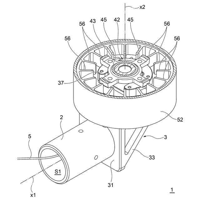無人機1の本体内には、無人機1の駆動を制御する制御装置やバッテリ、各種のセンサ、カメラ等の部品が組み込まれる。この本体から、複数のロッド2が例えば放射状に延在している。この例では、ロッド2は、中心軸線x1を中心とする円筒状の例えば金属材料又は樹脂材料から形成される。ロッド2の先端は開放されている。ロッド2の内側の内部空間S1には配線5が収容される。配線5は、本体に組み込まれたバッテリ等とモータ4とを接続する。なお、ロッド2は、円筒状以外の形状を有してもよい。また、1本のロッド2が本体から直接延在している必要はなく、例えば、H型等のように、2つの先端を有するT字状のロッドが用いられてもよい。また、1本の配線5が図示されているが、ロッド2の内部空間S1には複数本の配線5が収容されてもよい。