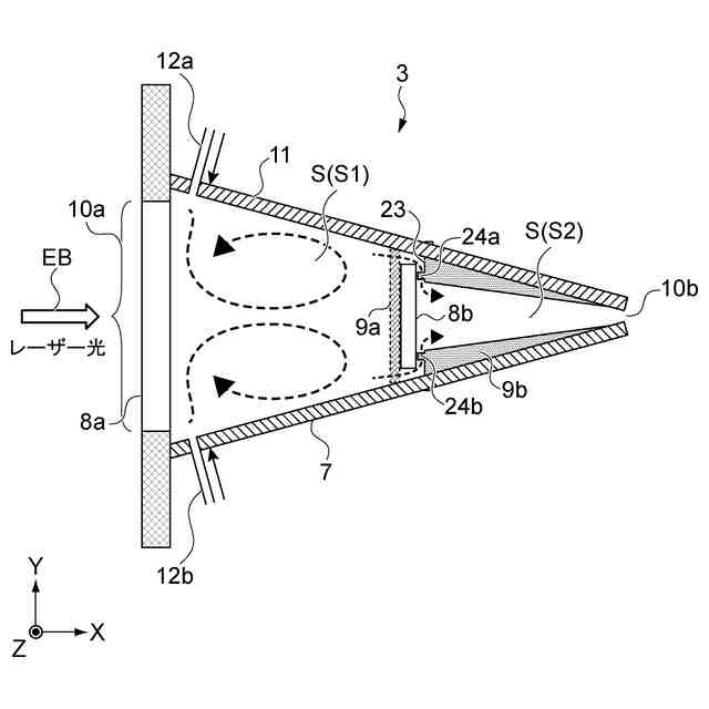 LPP光源装置は、EUV放射種をレーザビーム等により励起して高温プラズマを生成するものである。この方式の光源装置としては、微小な液滴状に噴出された高温プラズマ原料のドロップレットに対して、レーザ光を集光することにより当該ターゲット材料を励起してプラズマを発生させるものが知られている。