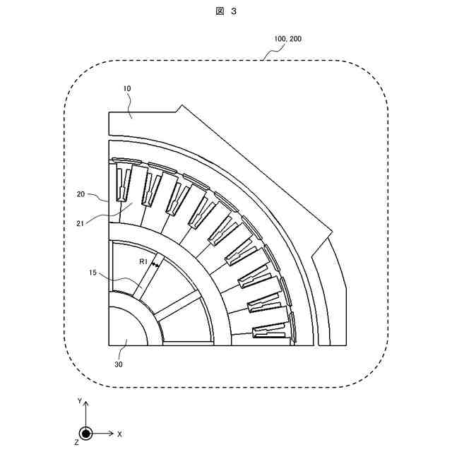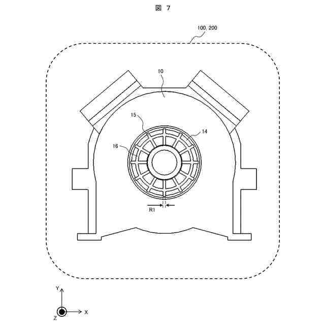 上記した課題を解決するために、本発明の外転型回転電機は、固定子フレームと、前記固定子フレームに取付けられた固定子と、前記固定子フレームに固定された軸と、前記固定子よりも前記軸の外周側に配置された回転子と、を有する外転型回転電機であって、前記固定子は、固定子コアと、コイルと、を有し、前記固定子フレームは、前記軸の周囲に形成され前記軸の軸方向に窪んだ凹部と、前記凹部と前記固定子コアとの間に位置して前記固定子コアに接触する第一部分と、前記凹部と前記軸との間に位置して前記軸に接触する第二部分と、前記凹部内に形成され前記第一部分と前記第二部分との間を接続するリブと、を有し、前記リブは、前記第一部分および前記第二部分と一体的に形成されているとともに、前記固定子コアと重なる位置に配置されていることを特徴とする。